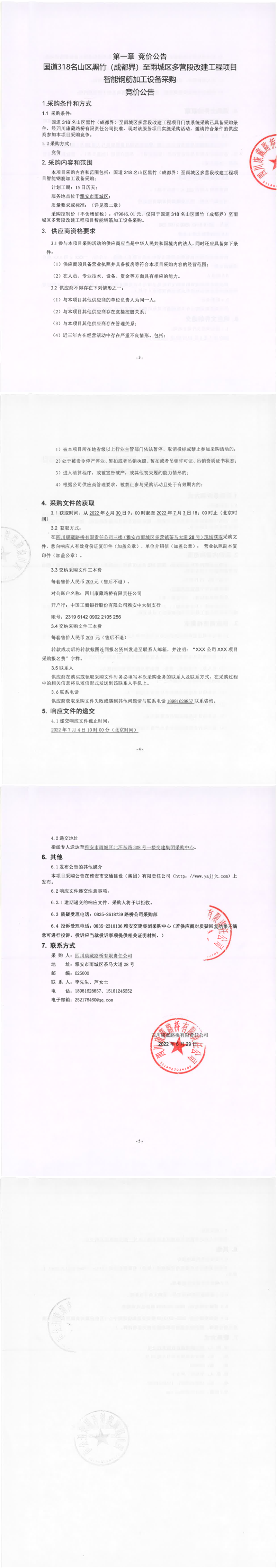 四川康藏路橋有限責(zé)任公司國(guó)道318名山區(qū)黑竹(成都界)至雨城區(qū)多營(yíng)段改建工程項(xiàng)目智能鋼筋加工設(shè)備采購(gòu)競(jìng)價(jià)公告