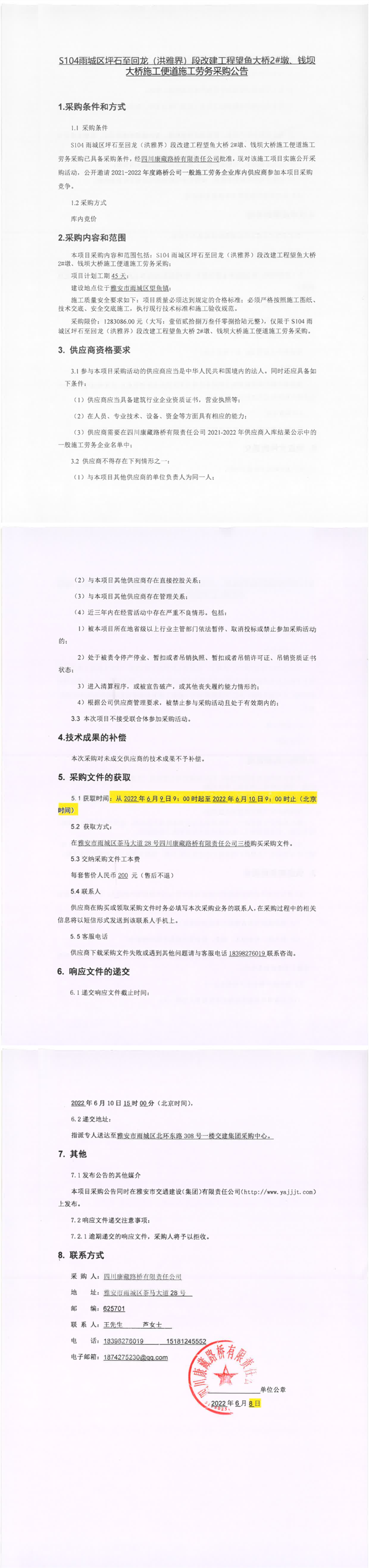四川康藏路橋有限責任公司S104雨城區(qū)坪石至回龍(洪雅界)段改建工程望魚大橋2#墩、錢壩大橋施工便道施工勞務采購公告