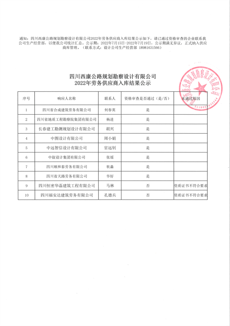 四川西康公路規(guī)劃勘察設(shè)計有限公司2022年勞務(wù)供應(yīng)商入庫結(jié)果公示