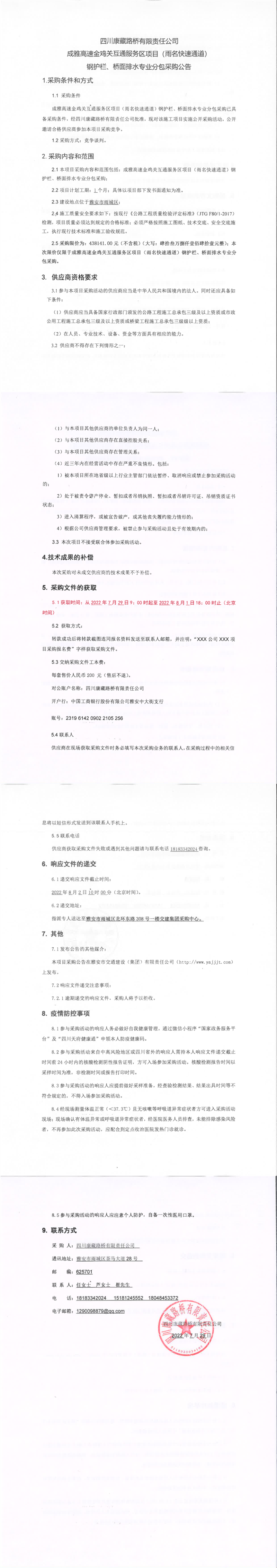四川康藏路橋有限責(zé)任公司成雅高速金雞關(guān)互通服務(wù)區(qū)項目(雨名快速通道)鋼護(hù)欄、橋面攔水專業(yè)分包采購公告