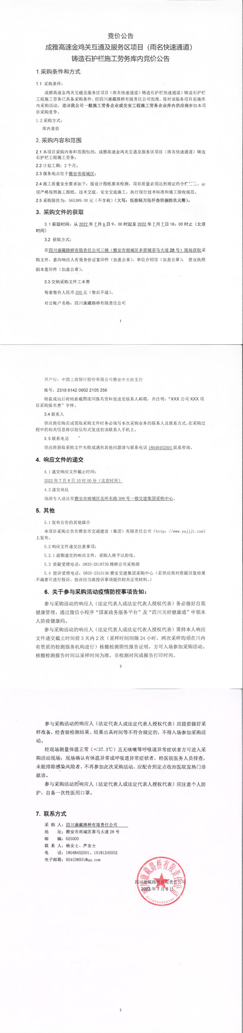 四川康藏路橋有限責(zé)任公司成雅高速金雞關(guān)互通及服務(wù)區(qū)項目(雨名快速通道)鑄造石護(hù)欄施工勞務(wù)庫內(nèi)競價公告