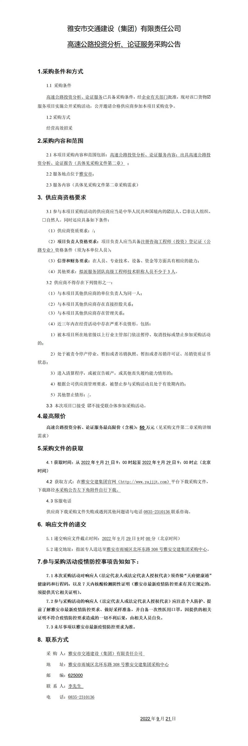 雅安市交通建設(集團)有限責任公司高速公路投資分析、論證服務采購公告