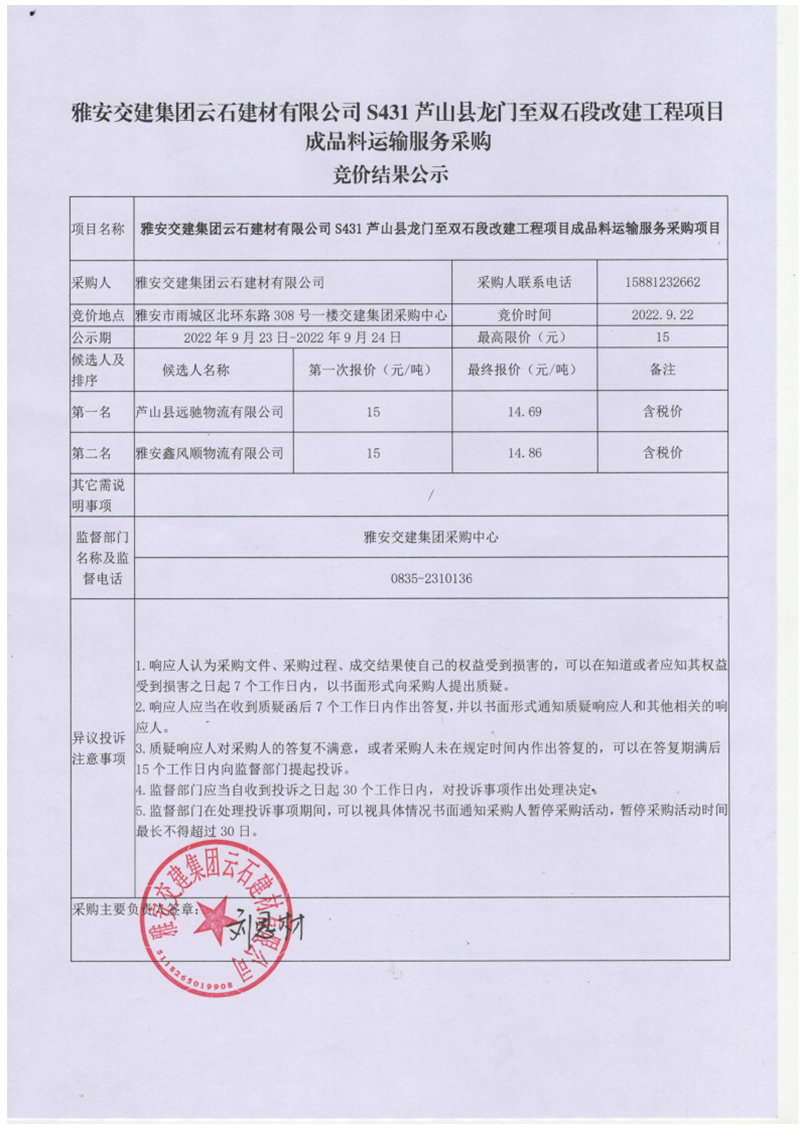 雅安交建集團(tuán)云石建材有限公司S431蘆山縣龍門至雙石段改建工程項目成品料運輸服務(wù)采購競價結(jié)果公示