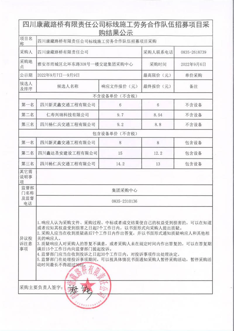 四川康藏路橋有限責任公司標線施工勞務合作隊伍招募項目采購結(jié)果公示