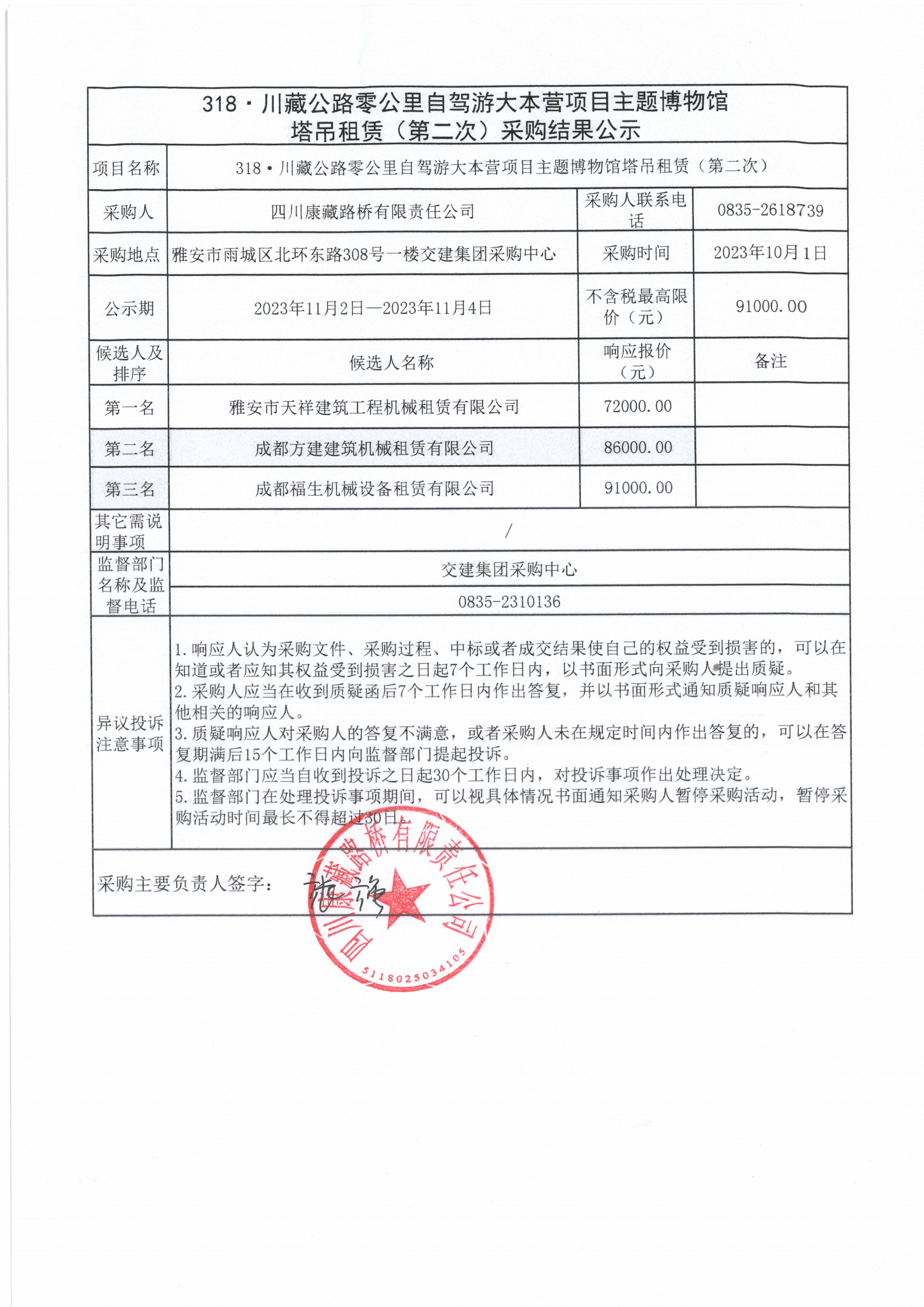 四川康藏路橋有限責任公司318·川藏公路零公里自駕游大本營項目主題博物館塔吊租賃(第二次)采購結果公示