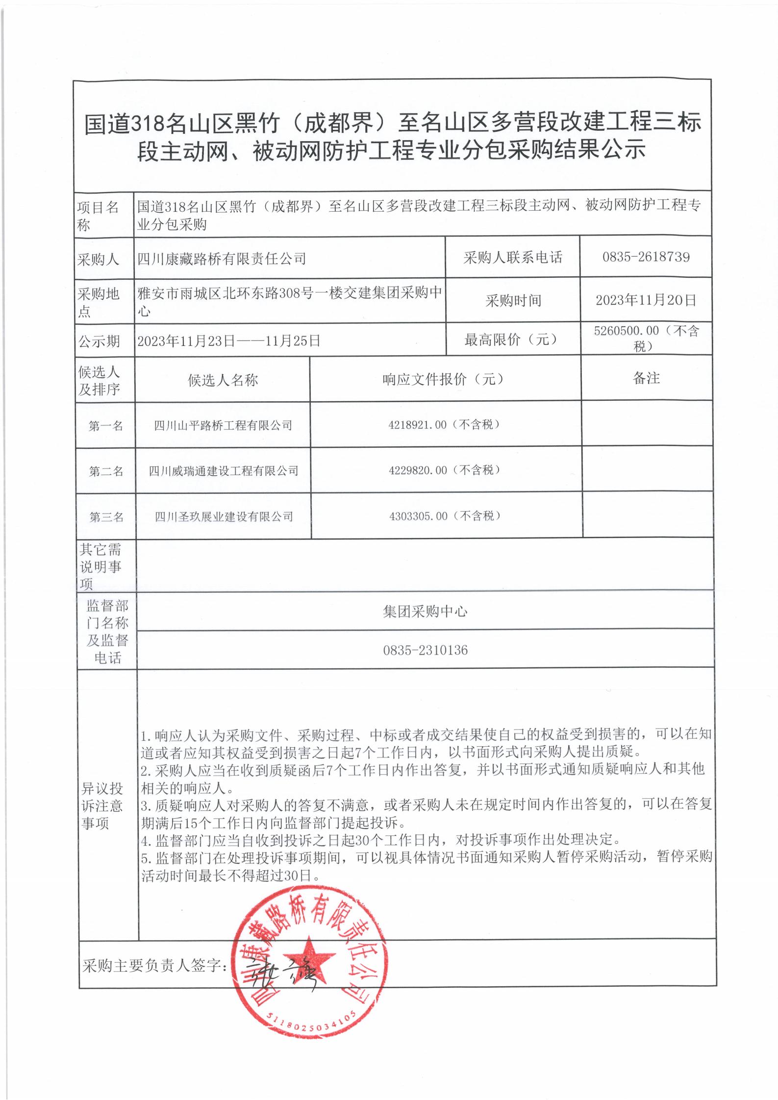 四川康藏路橋有限責任公司國道318名山區(qū)黑竹(成都界)至名山區(qū)多營段改建工程三標段主動網、被動網防護工程專業(yè)分包采購結果公示