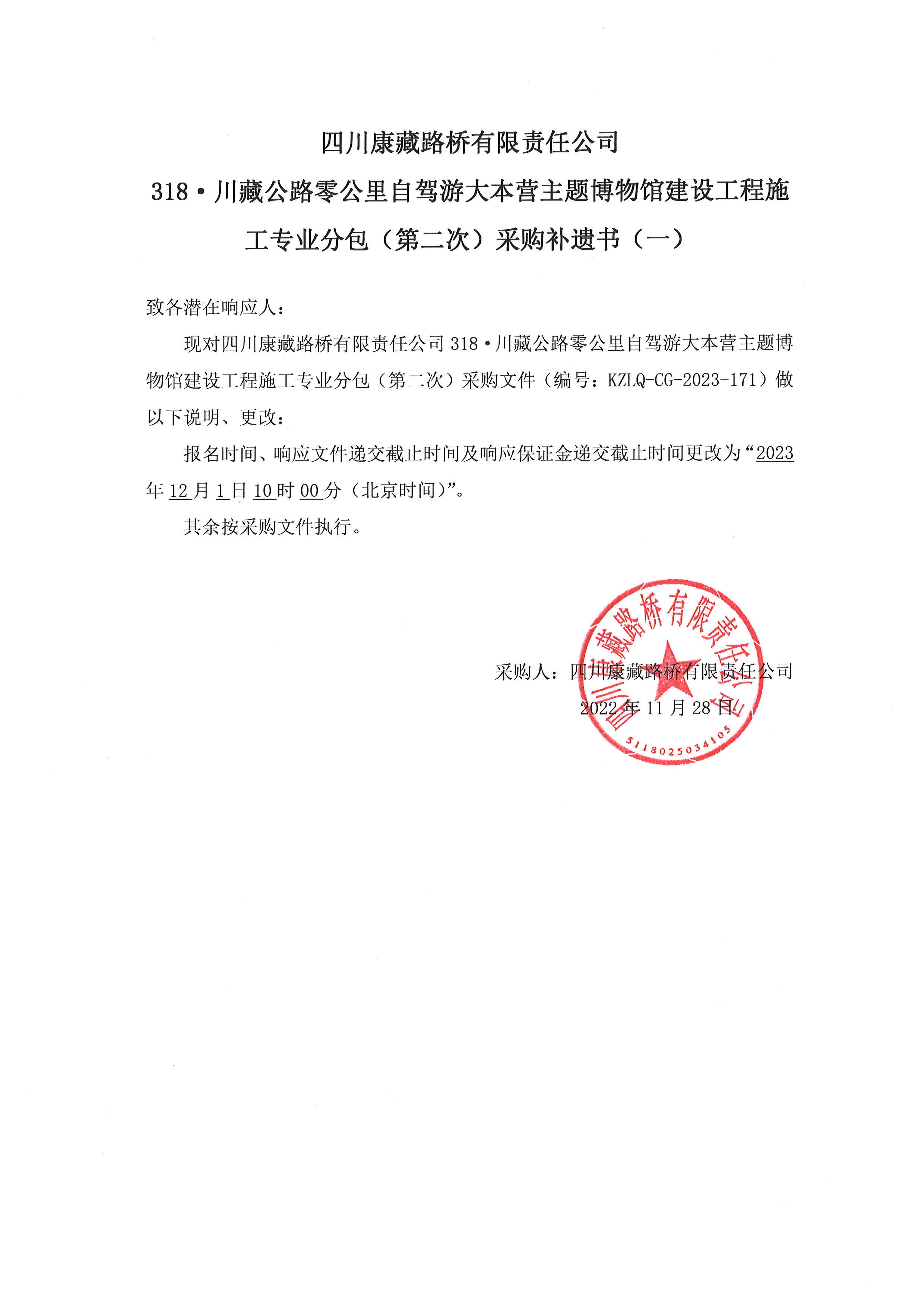 四川康藏路橋有限責任公司318·川藏公路零公里自駕游大本營主題博物館建設工程施工專業(yè)分包(第二次)采購補遺書(一)