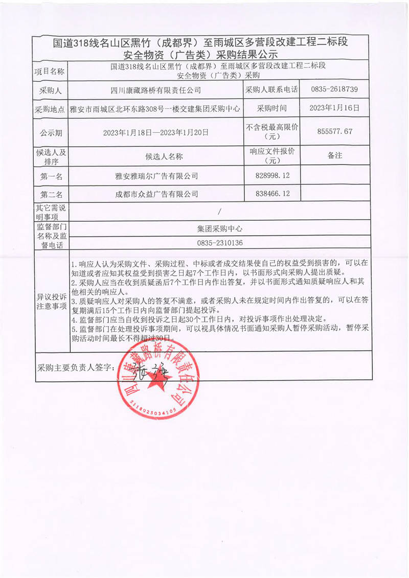 四川康藏路橋有限責(zé)任公司國(guó)道318線名山區(qū)黑竹(成都界)至雨城區(qū)多營(yíng)段改建工程二標(biāo)段安全物資(廣告類)采購(gòu)結(jié)果公示