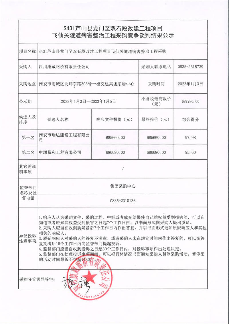 四川康藏路橋有限責(zé)任公司S431蘆山縣龍門至雙石段改建工程項(xiàng)目飛仙關(guān)隧道病害整治工程采購競爭談判結(jié)果公示
