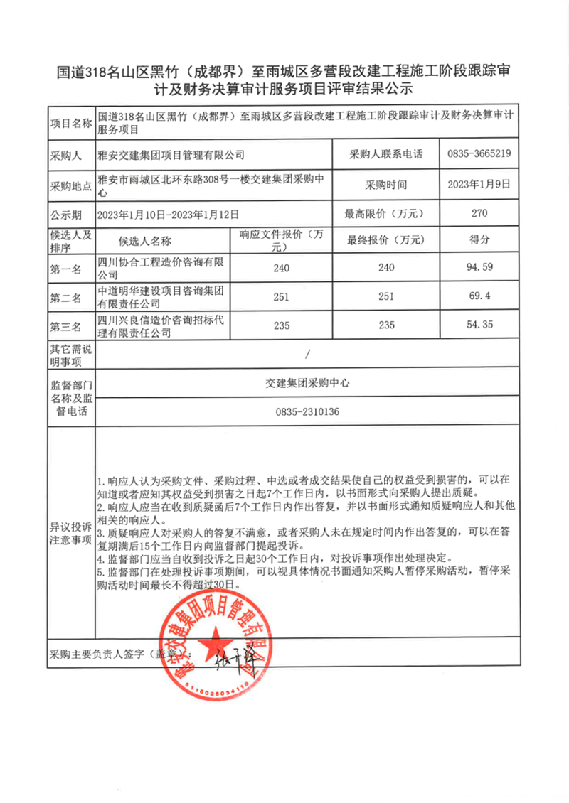 雅安交建集團(tuán)項(xiàng)目管理有限公司國(guó)道318名山區(qū)黑竹(成都界)至雨城區(qū)多營(yíng)段改建工程施工階段跟蹤審計(jì)及財(cái)務(wù)決算審計(jì)服務(wù)項(xiàng)目評(píng)審結(jié)果公示