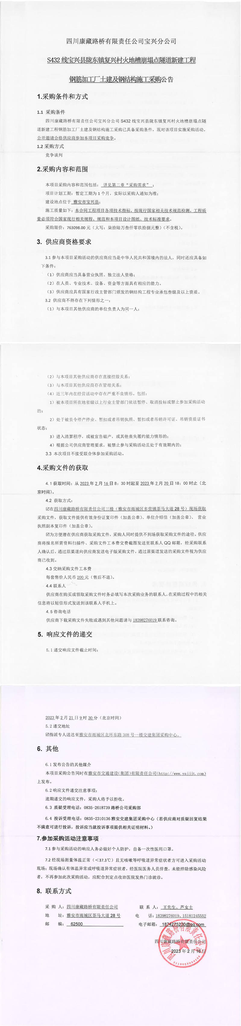 四川康藏路橋有限責(zé)任公司寶興分公司S432線寶興縣隴東鎮(zhèn)復(fù)興村火地槽崩塌點隧道新建工程鋼筋加工廠土建及鋼結(jié)構(gòu)施工采購公告