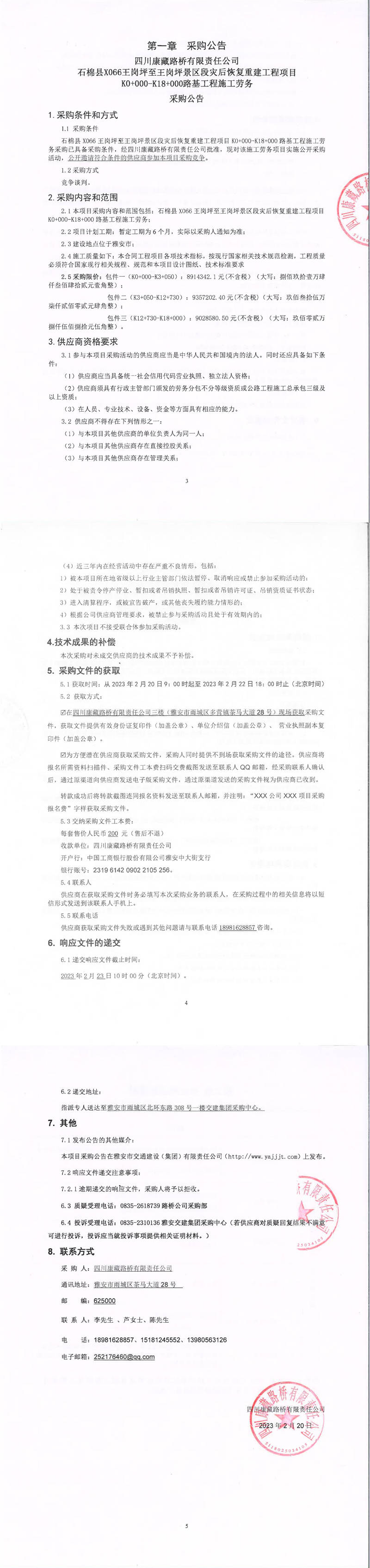 四川康藏路橋有限責任公司石棉縣X066王崗坪至王崗坪景區(qū)段災后恢復重建工程項目K0+000-K18+000路基工程施工勞務采購公告