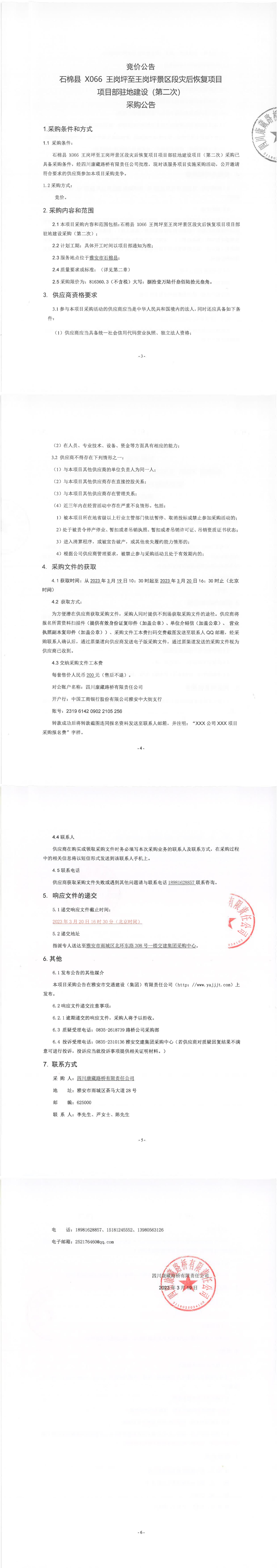 四川康藏路橋有限責(zé)任公司石棉縣X066王崗坪至王崗坪景區(qū)段災(zāi)后恢復(fù)項(xiàng)目項(xiàng)目部駐地建設(shè)(第二次)采購(gòu)公告