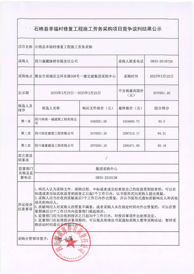 四川康藏路橋有限責任公司石棉縣幸福村修復工程施工勞務采購項目競爭談判結果公示