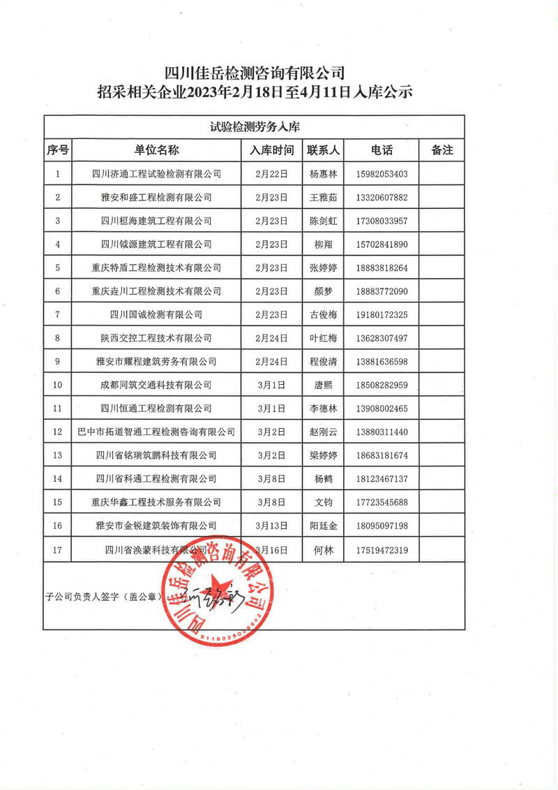 四川佳岳檢測(cè)咨詢有限公司(試驗(yàn)檢測(cè)勞務(wù)供應(yīng)商庫(kù))2023年2月18日至4月11日入庫(kù)結(jié)果公示