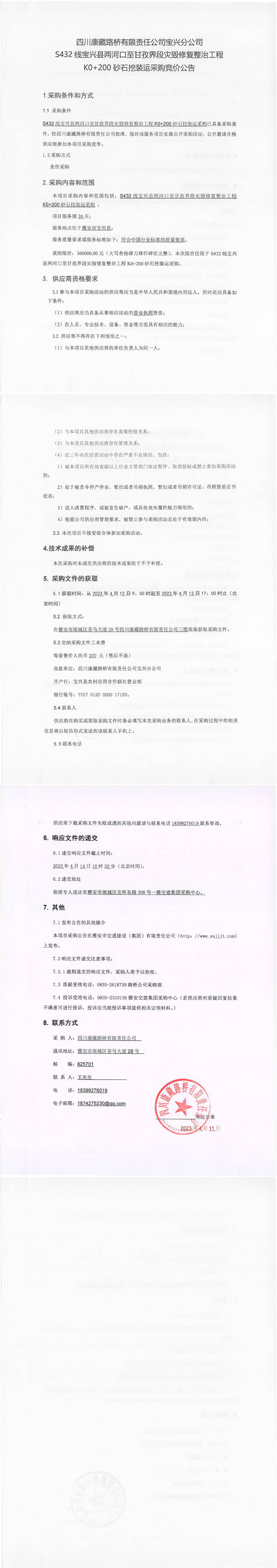 四川康藏路橋有限責任公司寶興分公司S432寶興縣兩河口至甘孜界段災毀修復整治工程K0+200砂石挖裝運采購競價公告