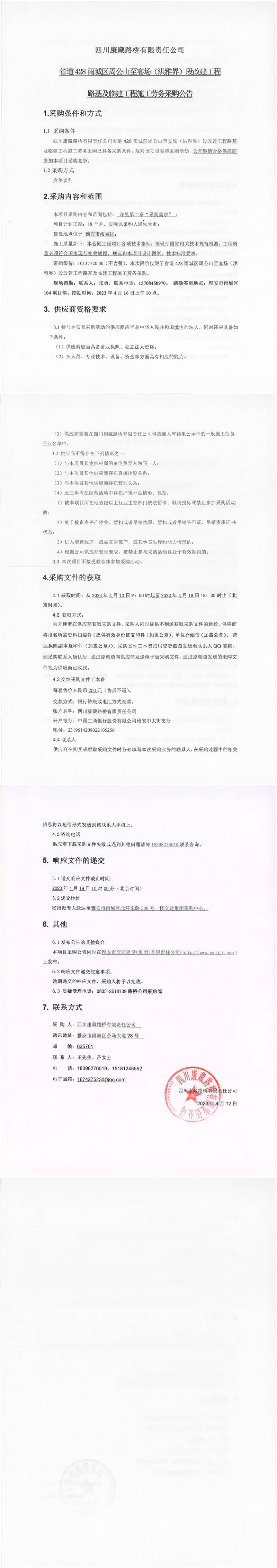 四川康藏路橋有限責(zé)任公司省道428雨城區(qū)周公山至宴場(chǎng)(洪雅界)段改建工程路基及臨建工程施工勞務(wù)采購(gòu)公告