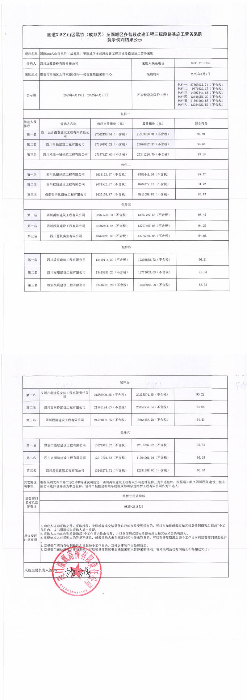 四川康藏路橋有限責任公司國道318名山區(qū)黑竹(成都界)至雨城區(qū)多營段改建工程三標段路基施工勞務采購競爭談判結果公示