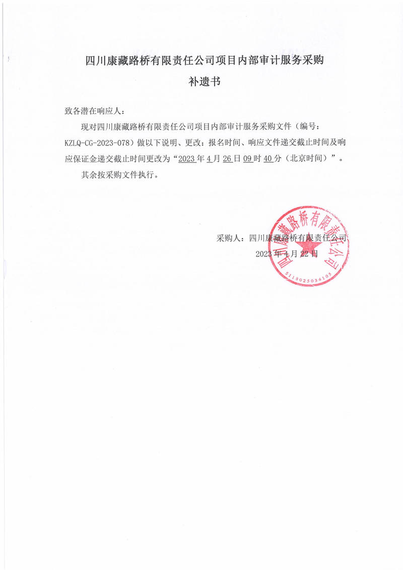 四川康藏路橋有限責(zé)任公司項(xiàng)目內(nèi)部審計服務(wù)采購補(bǔ)遺書