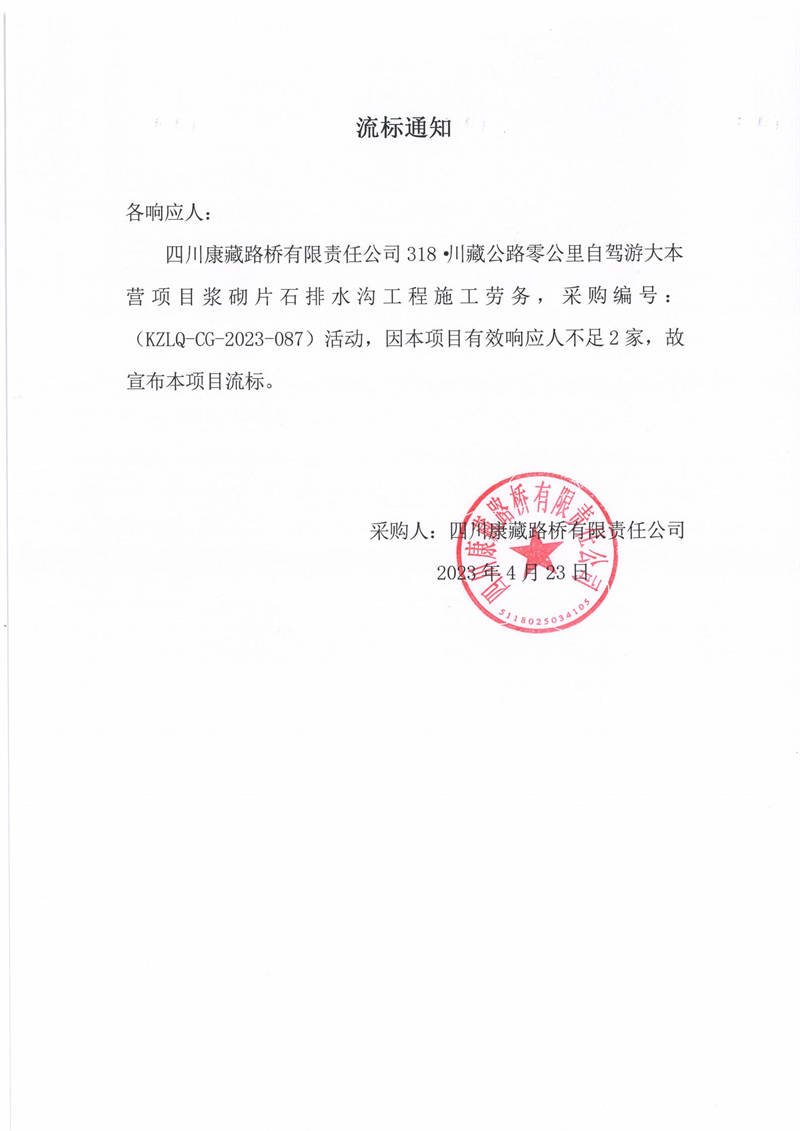 四川康藏路橋有限責(zé)任公司318·川藏公路零公里自駕游大本營項(xiàng)目漿砌片石排水溝工程施工勞務(wù)流標(biāo)通知