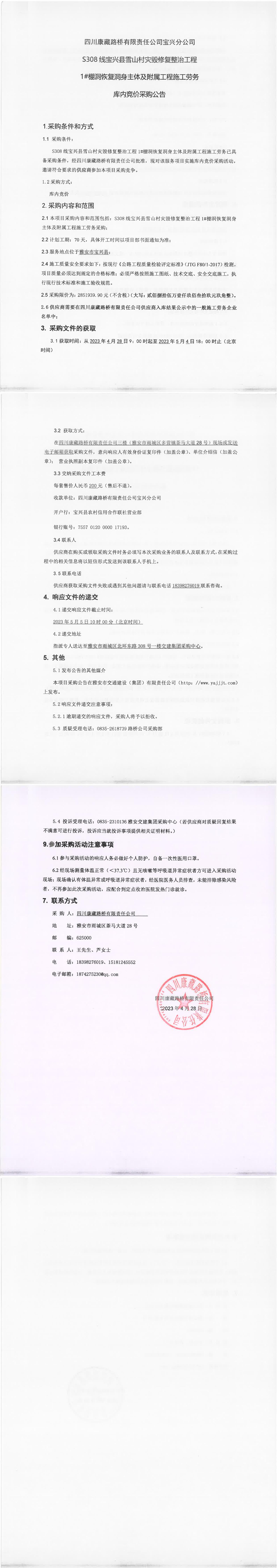 四川康藏路橋有限責任公司寶興分公司S308線寶興縣雪山村段災(zāi)毀修復(fù)整治工程1#棚洞恢復(fù)洞身主體及附屬工程施工勞務(wù)庫內(nèi)競價采購公告