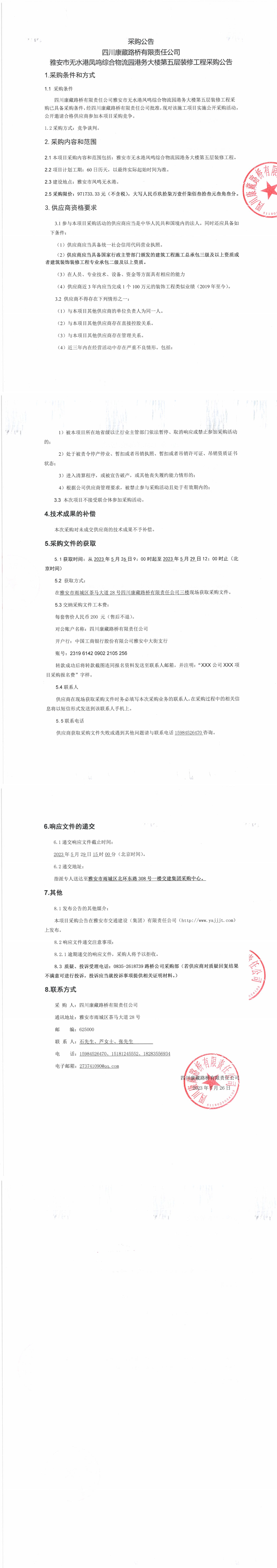 四川康藏路橋有限責(zé)任公司雅安市無(wú)水港鳳鳴綜合物流園港務(wù)大樓第五層裝修工程采購(gòu)公告