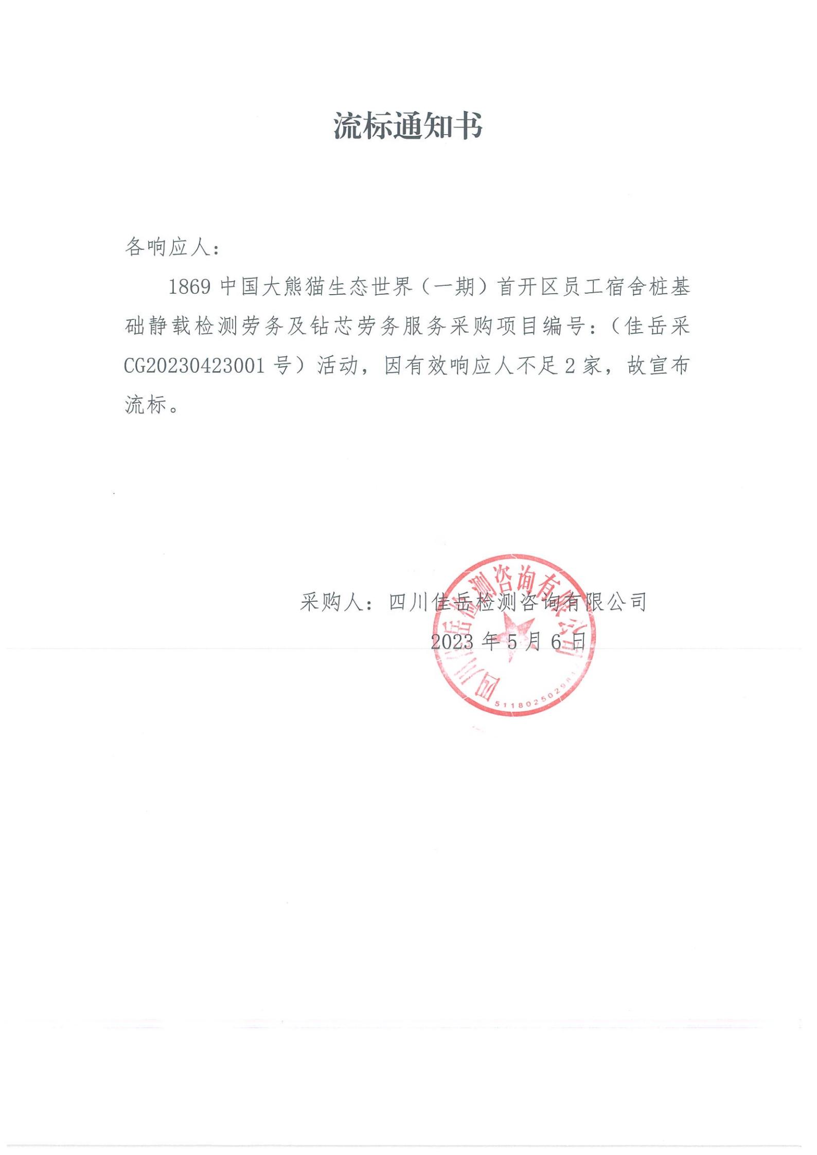 四川佳岳檢測(cè)咨詢有限公司1869中國(guó)大熊貓生態(tài)世界(一期)首開區(qū)員工宿舍樁基礎(chǔ)靜載檢測(cè)勞務(wù)及磚芯庫(kù)勞務(wù)服務(wù)流標(biāo)通知