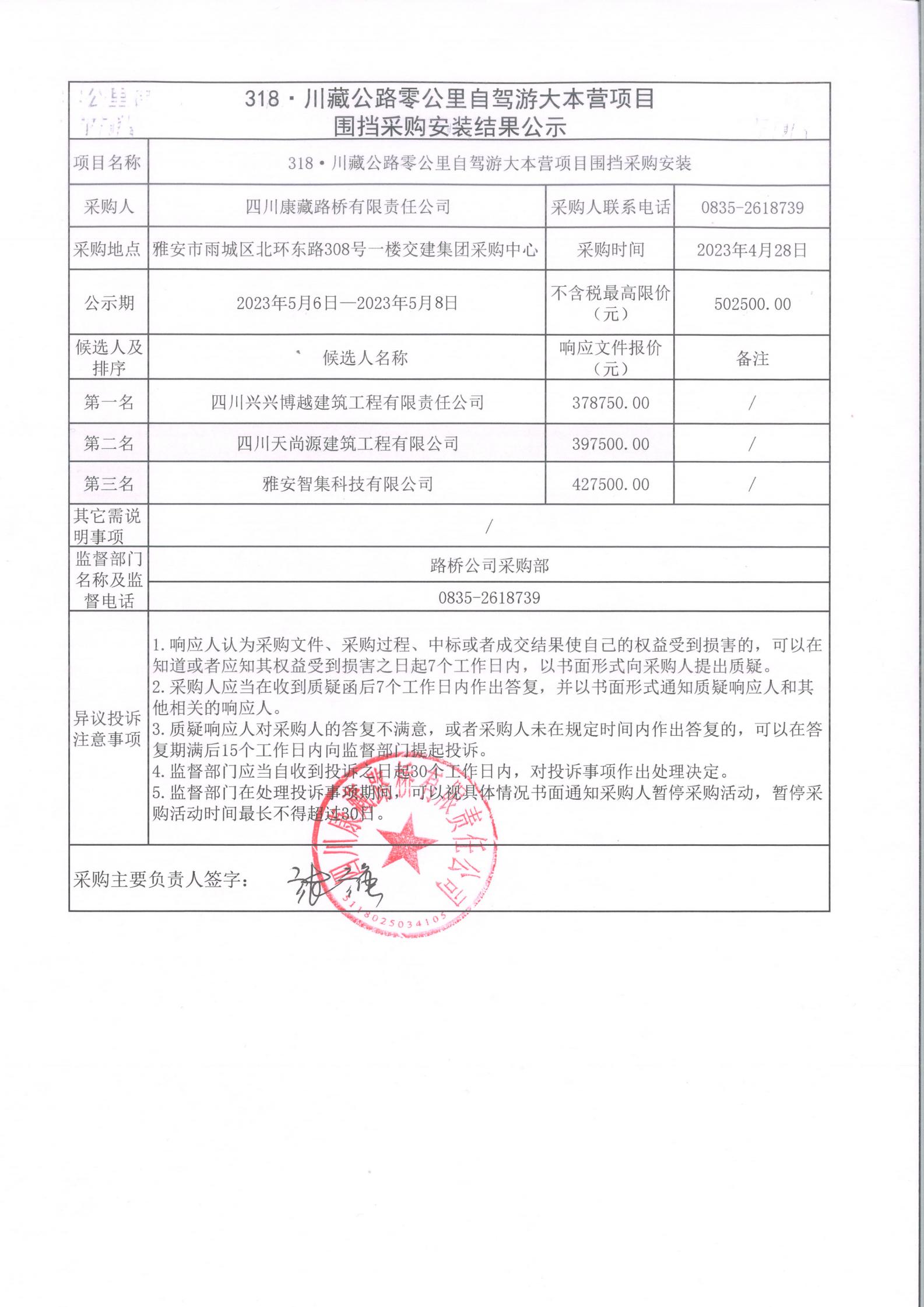 四川康藏路橋有限責(zé)任公司318·川藏公路零公里自駕游大本營(yíng)項(xiàng)目圍擋采購(gòu)安裝結(jié)果公示