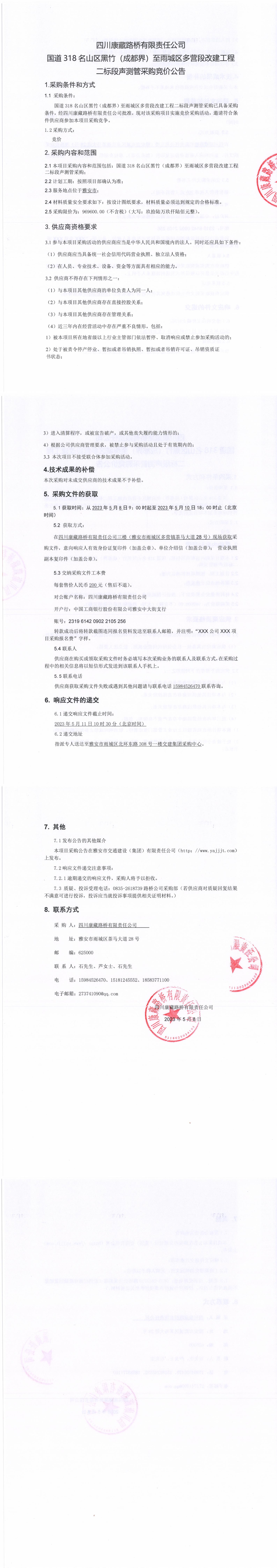 四川康藏路橋有限責(zé)任公司國道318名山區(qū)黑竹(成都界)至雨城區(qū)多營段改建工程二標(biāo)段聲測管采購競價公告