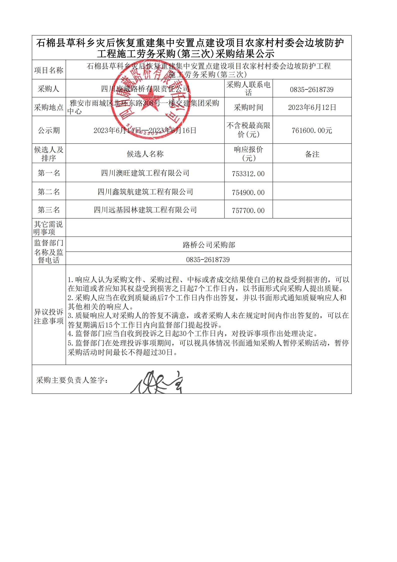 四川康藏路橋有限責任公司石棉縣草科鄉(xiāng)災后恢復重建集中安置點建設項目農(nóng)家村村委會邊坡防護工程施工勞務采購(第三次)結果公示
