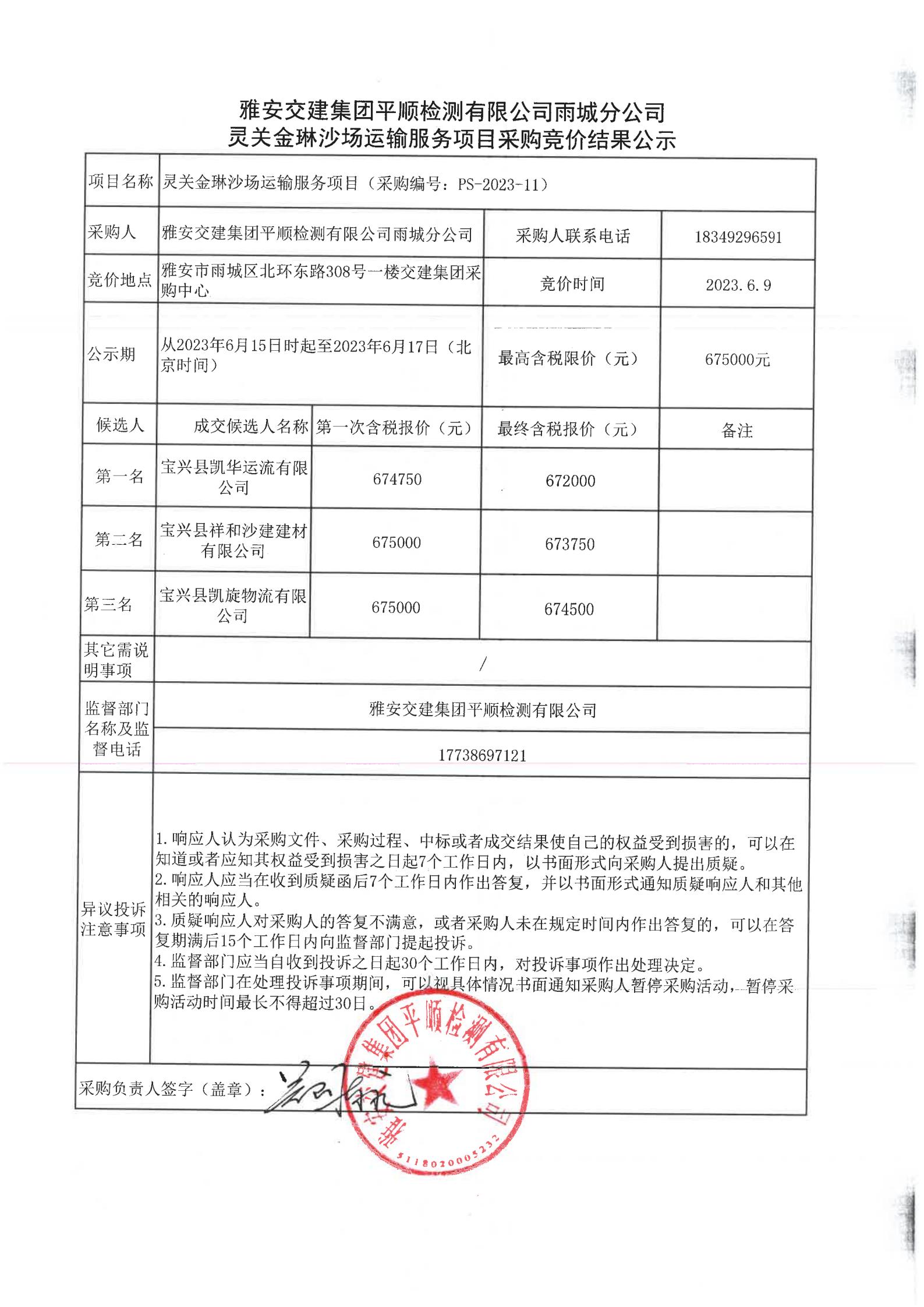 雅安交建集團(tuán)平順檢測(cè)有限公司雨城分公司靈關(guān)金琳沙場(chǎng)運(yùn)輸服務(wù)競(jìng)價(jià)結(jié)果公示