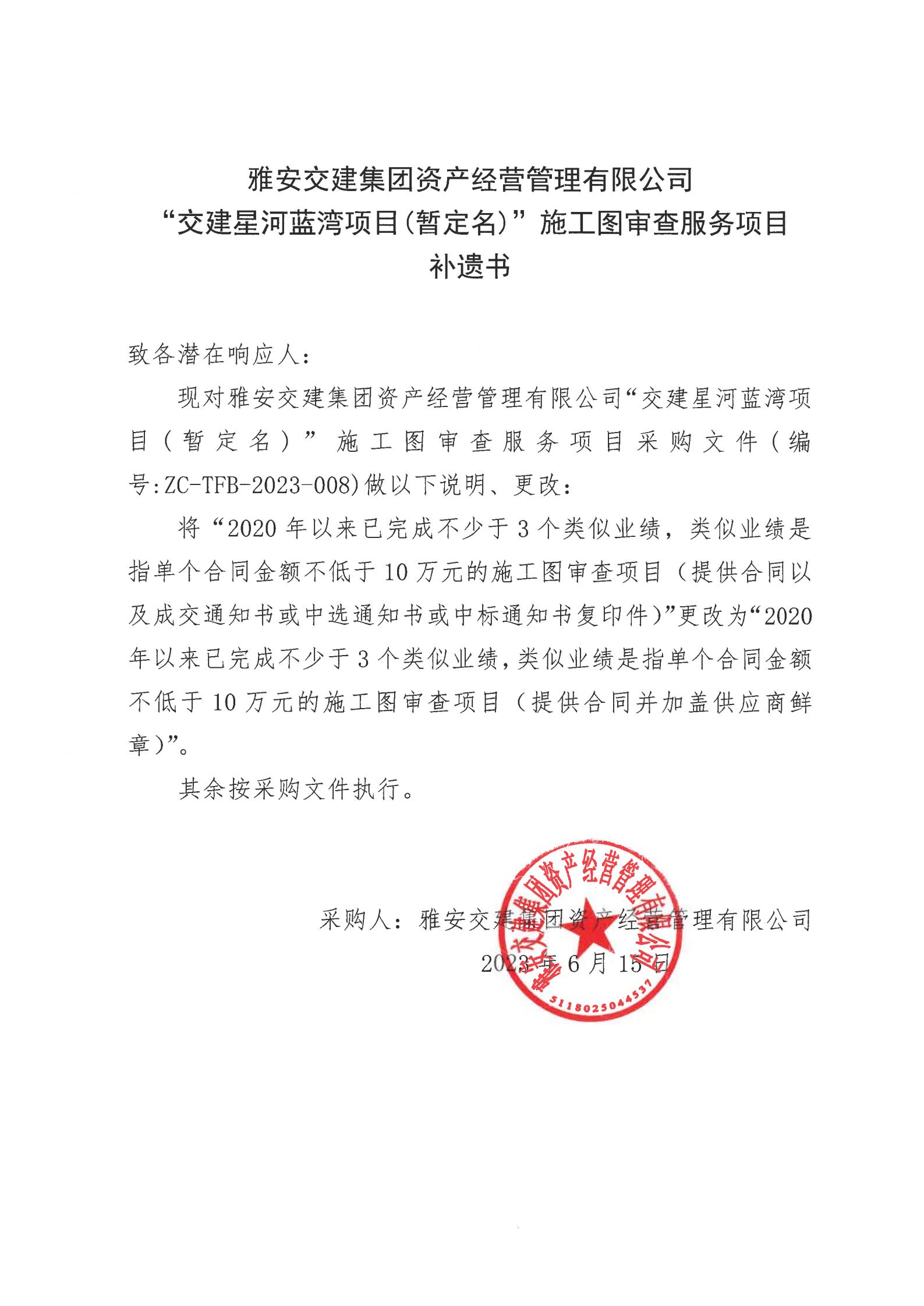 雅安交建集團資產(chǎn)經(jīng)營管理有限公司“交建星河藍灣項目(暫定名)”施工圖審查服務(wù)項目采購補遺書