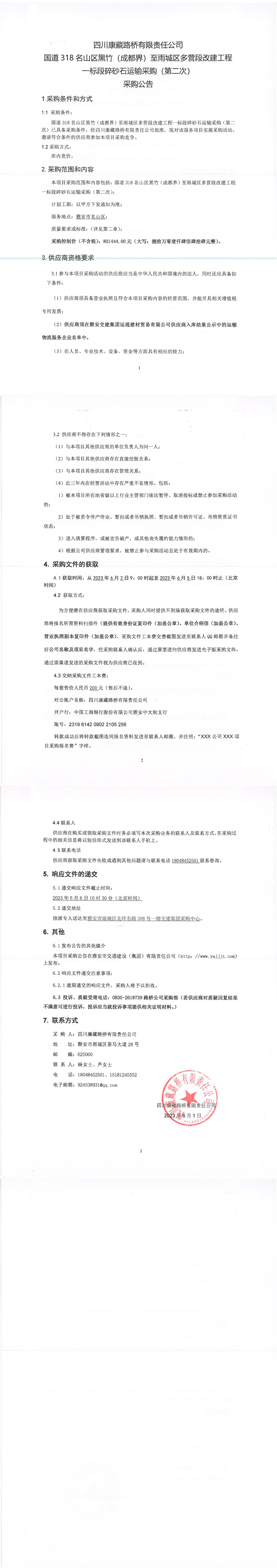 四川康藏路橋有限責(zé)任公司國(guó)道318名山區(qū)黑竹(成都界)至雨城區(qū)多營(yíng)段改建工程一標(biāo)段碎砂石運(yùn)輸采購(gòu)(第二次)采購(gòu)公告