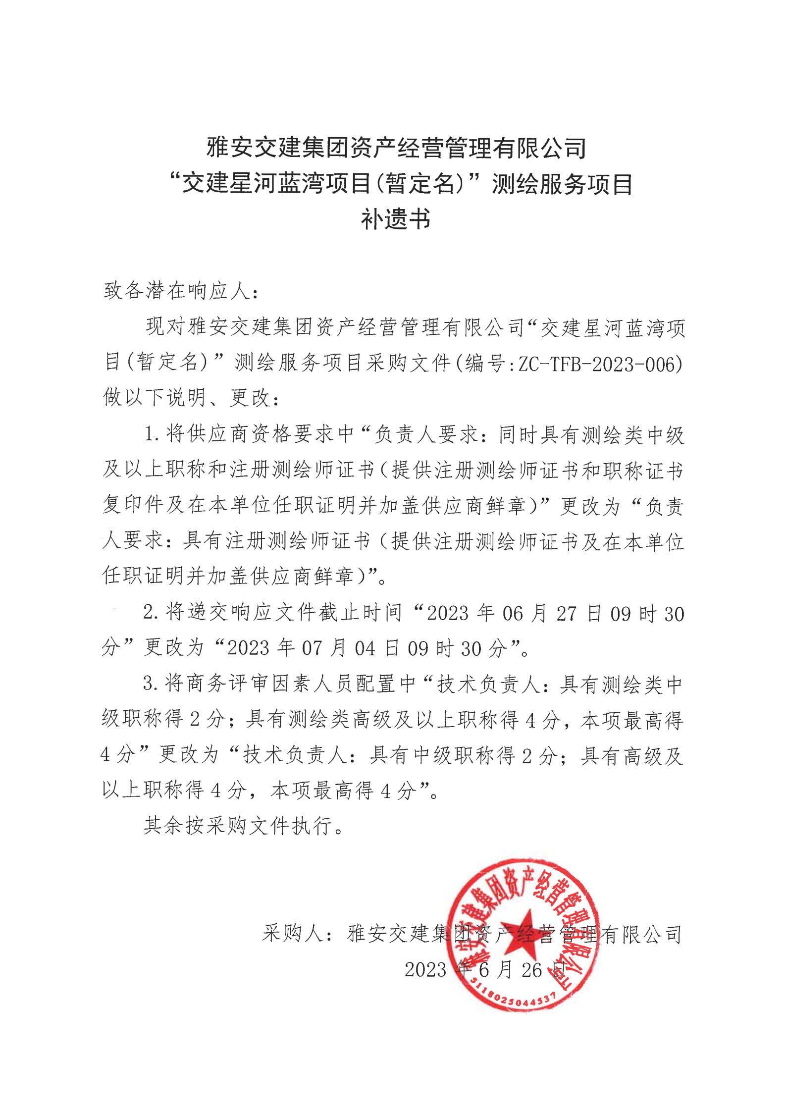 雅安交建集團資產(chǎn)經(jīng)營管理有限公司“交建星河藍灣項目(暫定名)”測繪服務(wù)項目補遺書