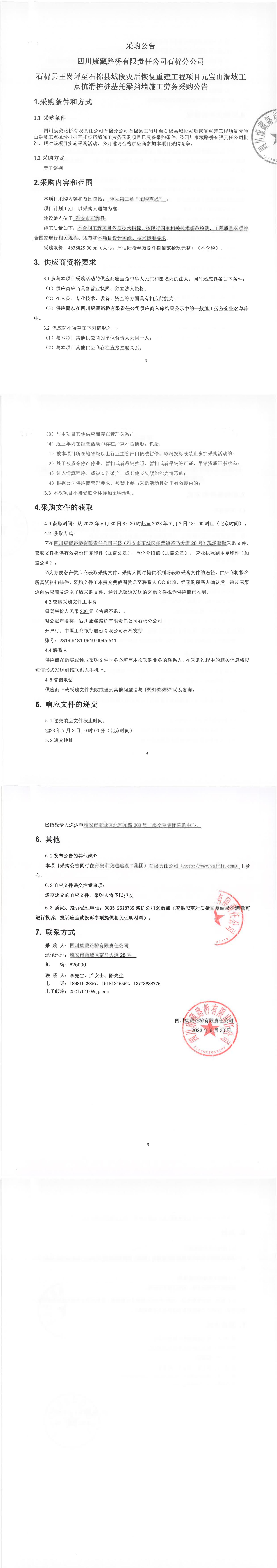 四川康藏路橋有限責(zé)任公司石棉縣王崗坪至石棉縣城段災(zāi)后恢復(fù)重建工程項(xiàng)目元寶山滑坡工點(diǎn)抗滑樁樁基托梁擋墻施工勞務(wù)采購(gòu)公告
