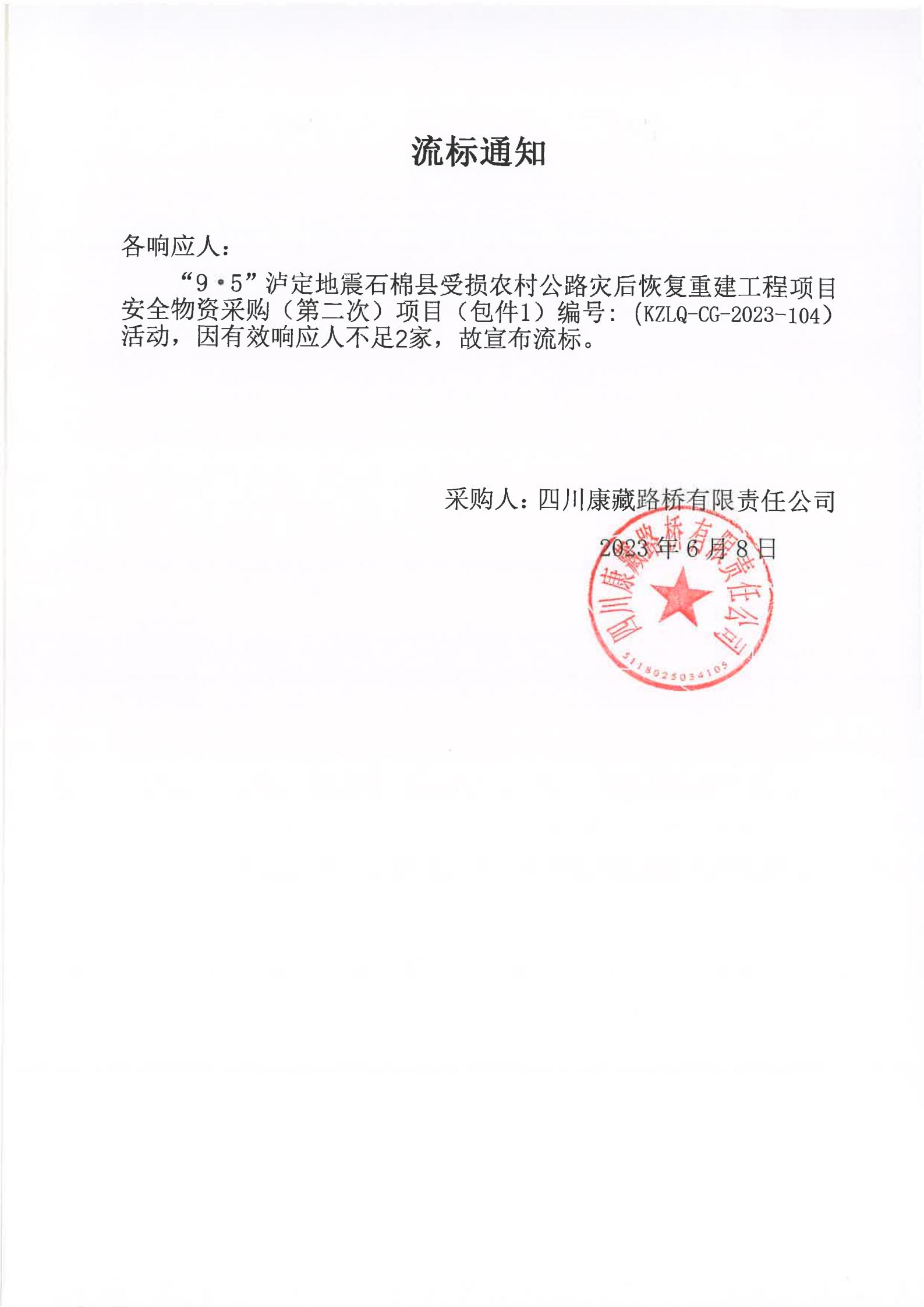 四川康藏路橋有限責任公司“9·5”瀘定地震石棉縣受損農村公路災后恢復重建工程項目安全物資競價采購(第二次)流標通知