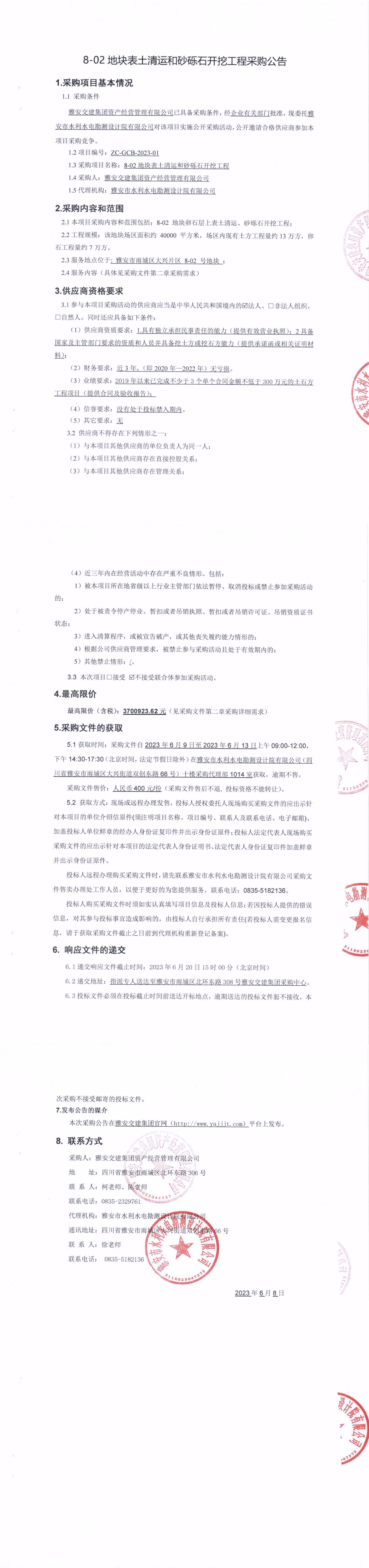 雅安交建集團(tuán)資產(chǎn)經(jīng)營管理有限公司8-02地塊表土清運和砂礫石開挖工程采購公告