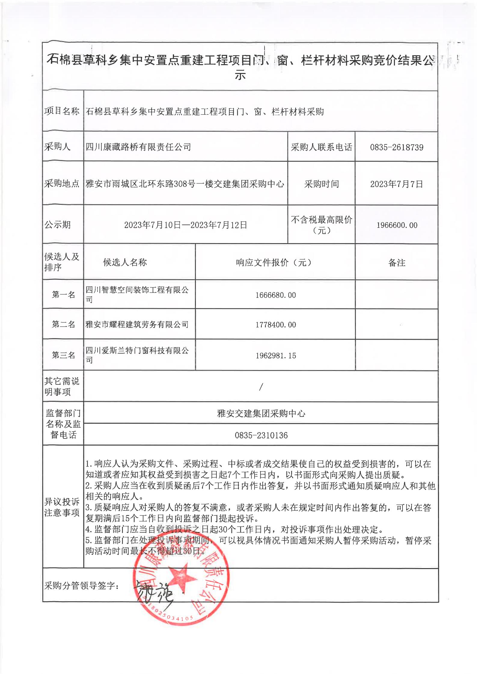 四川康藏路橋有限責(zé)任公司石棉草科鄉(xiāng)集中安置點(diǎn)重建工程項(xiàng)目門(mén)、窗、欄桿材料采購(gòu)競(jìng)價(jià)結(jié)果公示