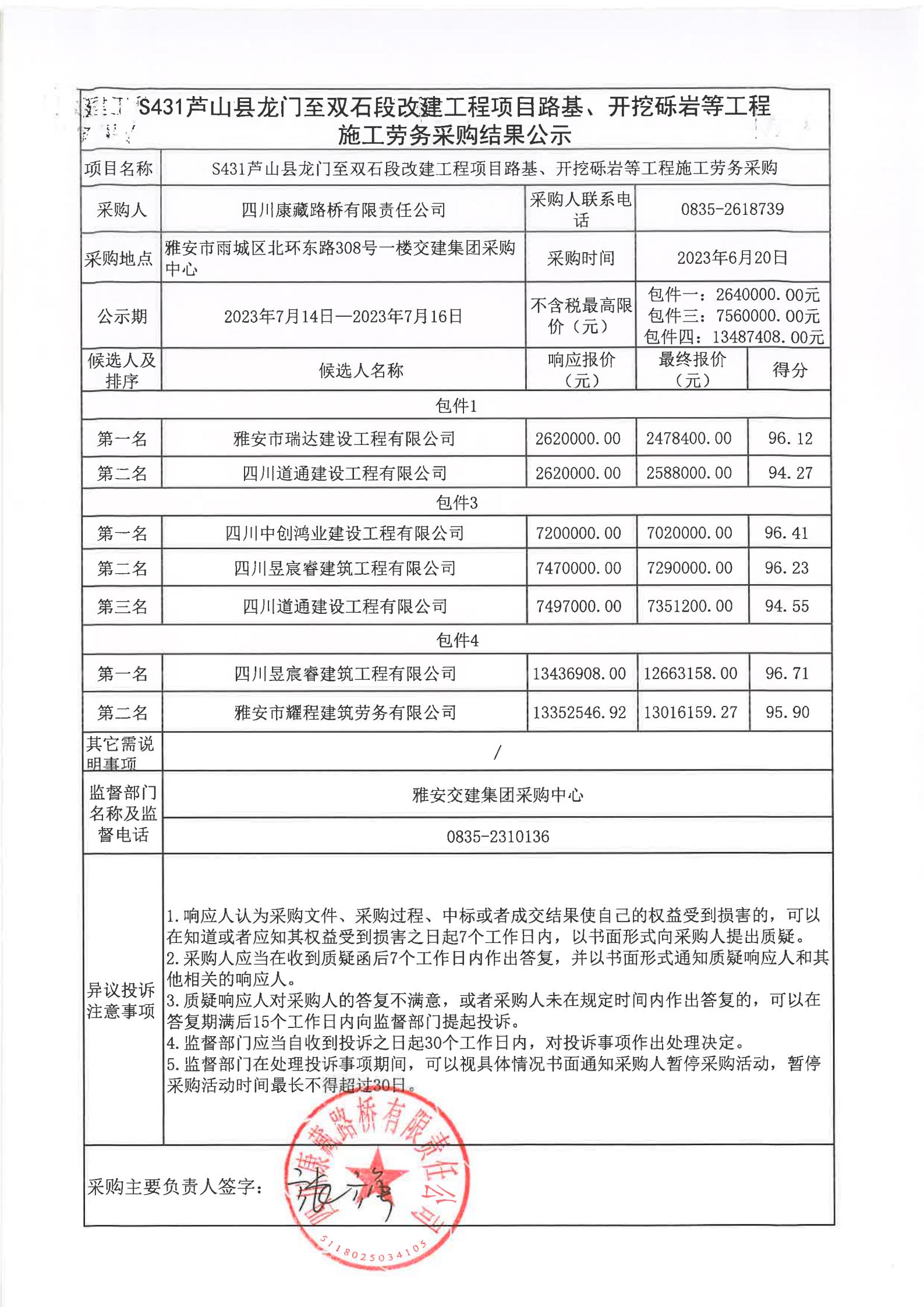 四川康藏路橋有限責任公司S431蘆山縣龍門至雙石段改建工程項目路基、開挖礫巖等工程施工勞務采購結果公示