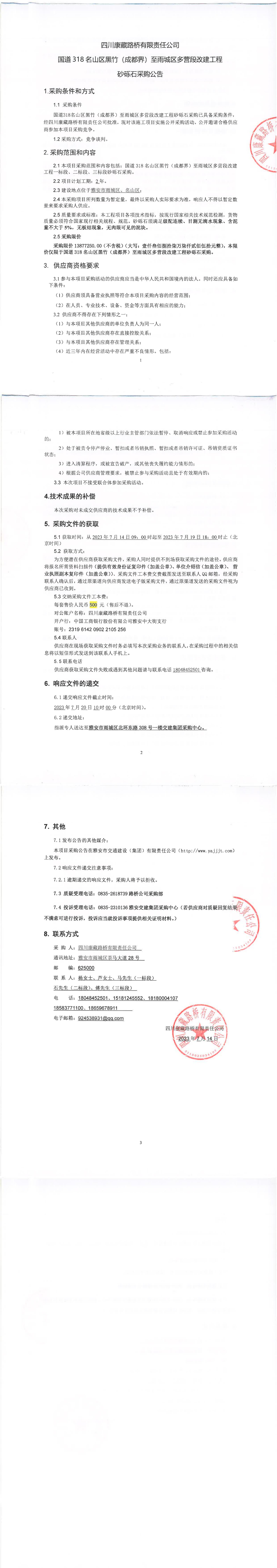 四川康藏路橋有限責任公司國道318名山區(qū)黑竹(成都界)至雨城區(qū)多營段改建工程砂礫石采購公告