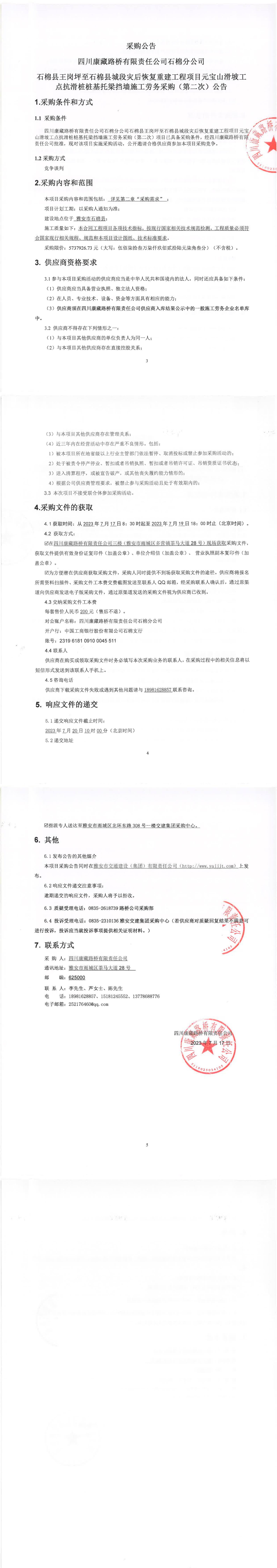 四川康藏路橋有限責(zé)任公司石棉分公司石棉縣王崗坪至石棉縣城段災(zāi)后恢復(fù)重建工程項目元寶山滑坡工點(diǎn)抗滑樁樁基托梁擋墻施工勞務(wù)采購(第二次)公告