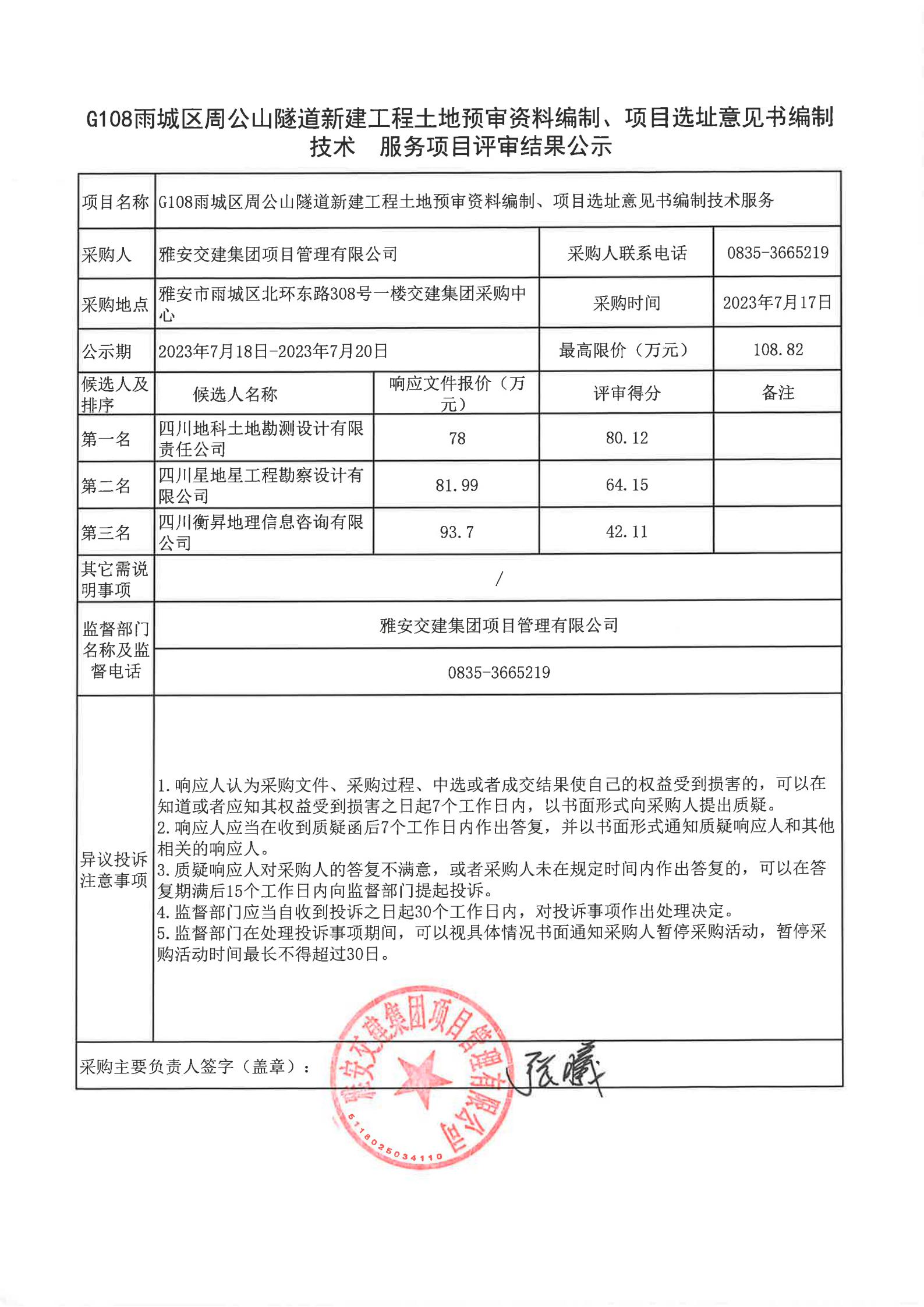 雅安交建集團項目管理有限公司G108雨城區(qū)周公山隧道新建工程土地預審資料編制、項目選址意見書編制技術(shù)服務項目評審結(jié)果公示