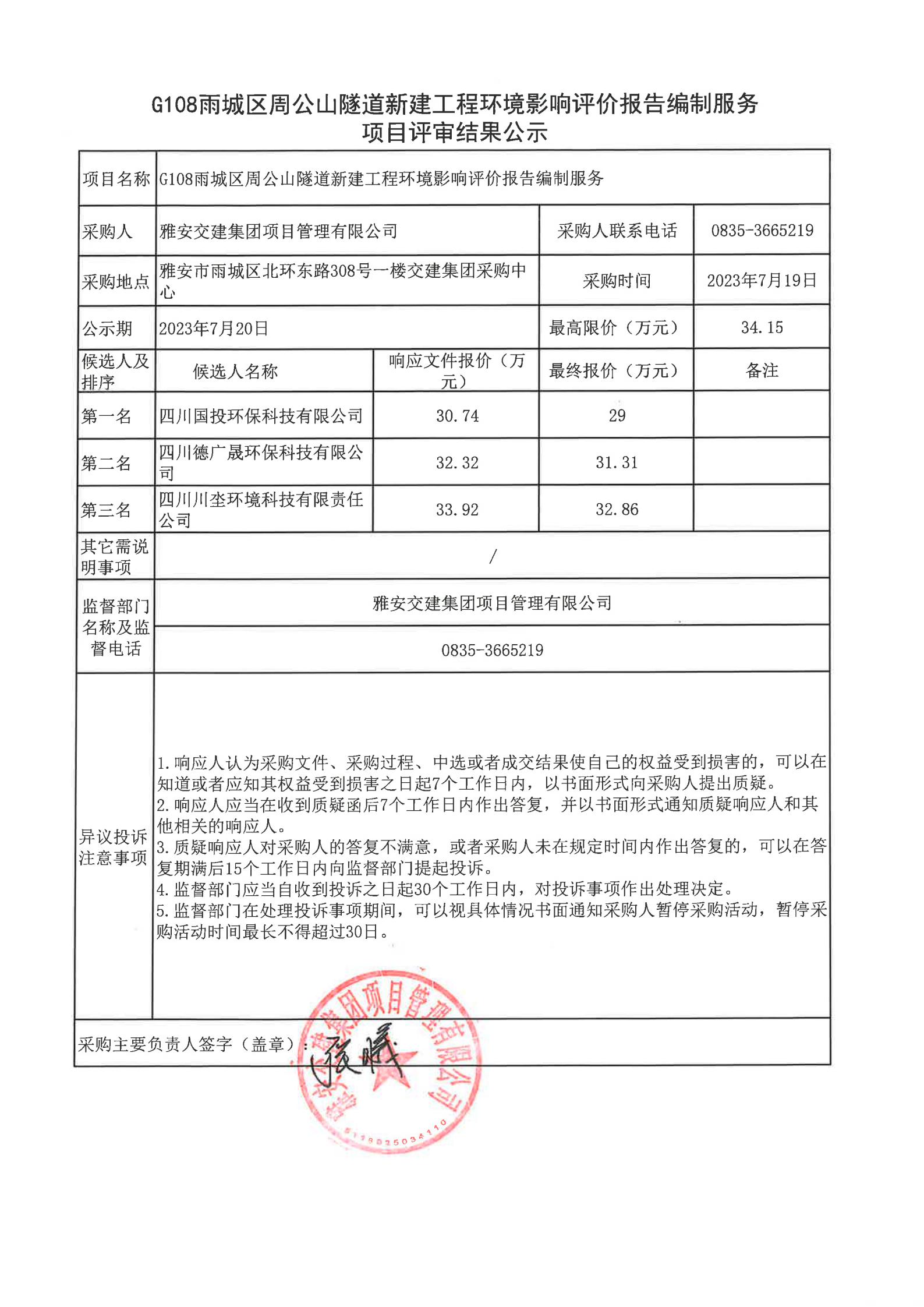 雅安交建集團項目管理有限公司G108雨城區(qū)周公山隧道新建工程環(huán)境影響評價報告編制服務(wù)項目評審結(jié)果公示