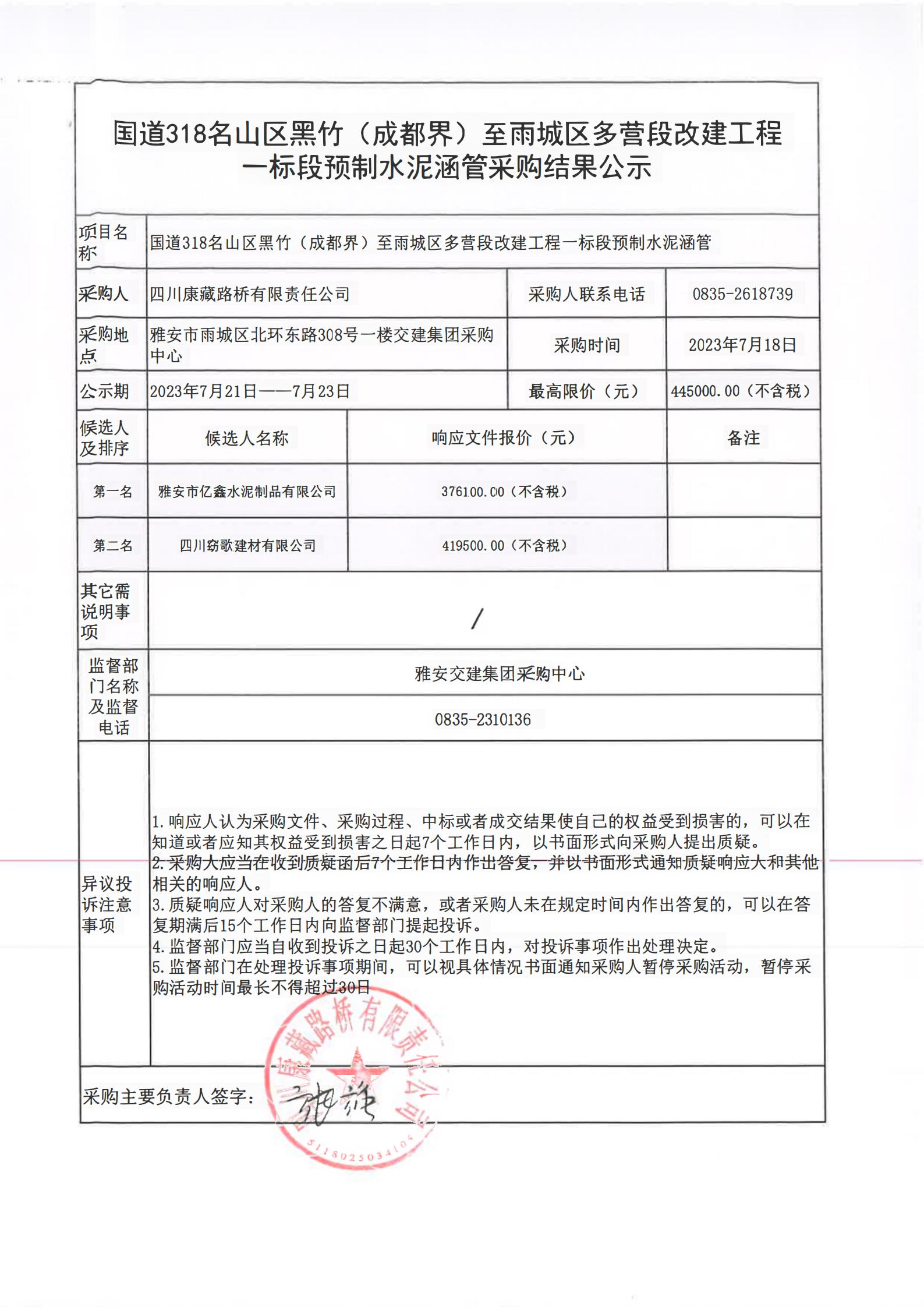 四川康藏路橋有限責(zé)任公司國(guó)道318名山區(qū)黑竹(成都界)至雨城區(qū)多營(yíng)段改建工程一標(biāo)段預(yù)制水泥涵管采購(gòu)結(jié)果公示