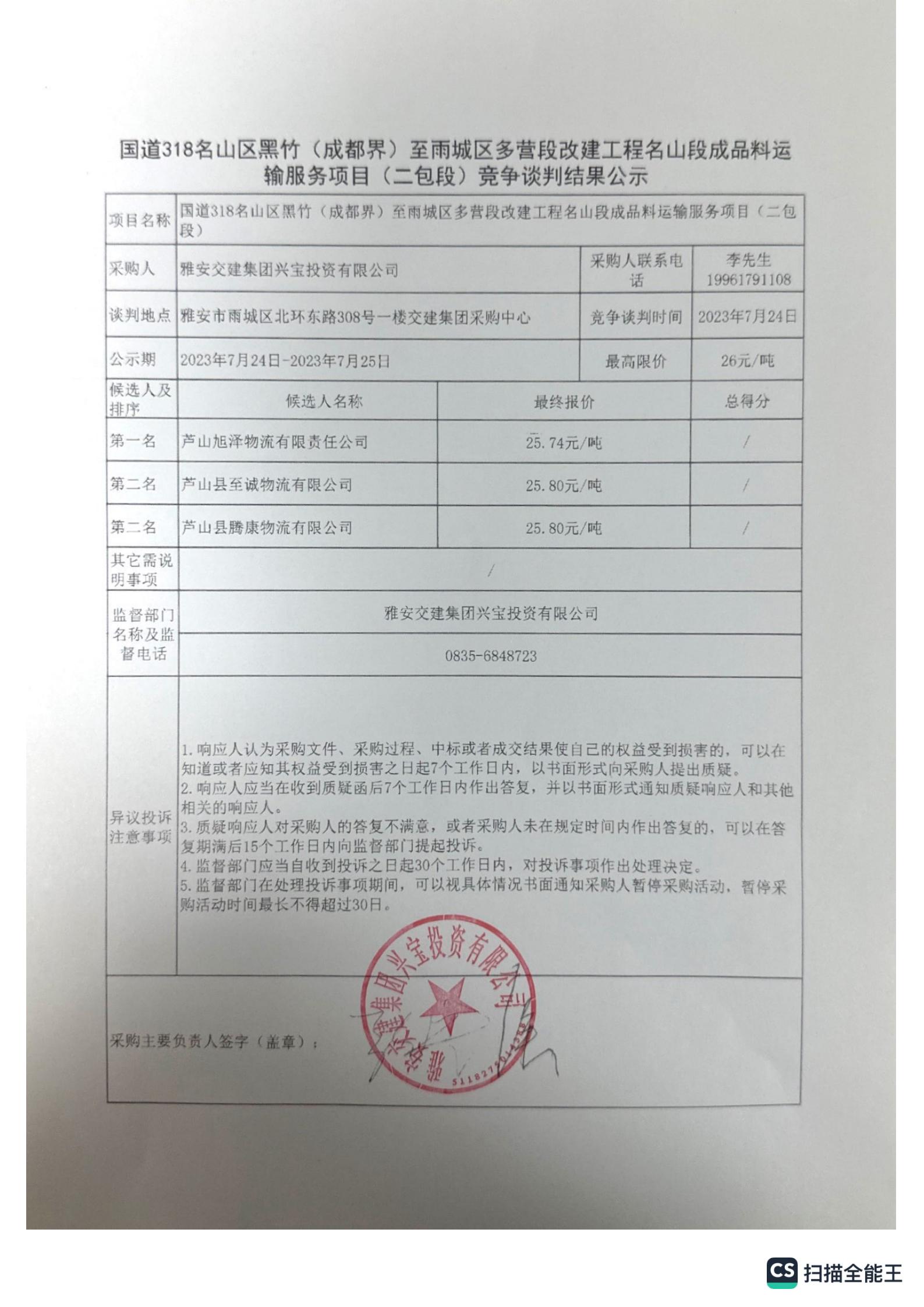 雅安交建集團興寶投資有限公司國道318名山區(qū)黑竹(成都界)至雨城區(qū)多營段改建工程名山段成品料運輸服務項目(一包段)競爭談判結果公示