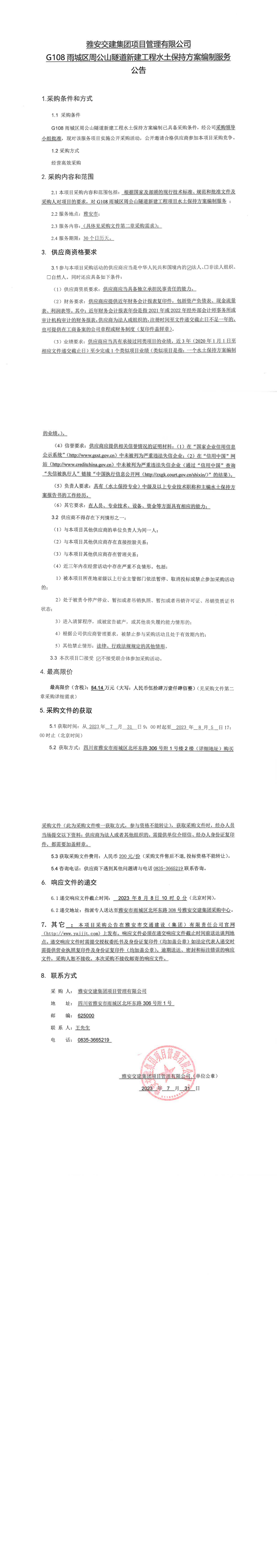 雅安交建集團(tuán)項(xiàng)目管理有限公司G108雨城區(qū)周公山隧道新建工程水土保持方案編制服務(wù)公告