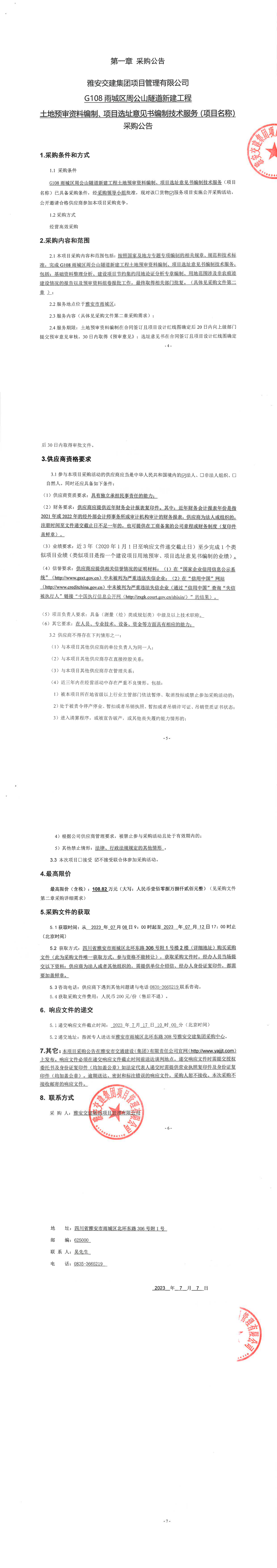 雅安交建集團(tuán)項目管理有限公司G108雨城區(qū)周公山隧道新建工程土地預(yù)審資料編制、項目選址意見書編制技術(shù)服務(wù)(項目名稱)采購公告