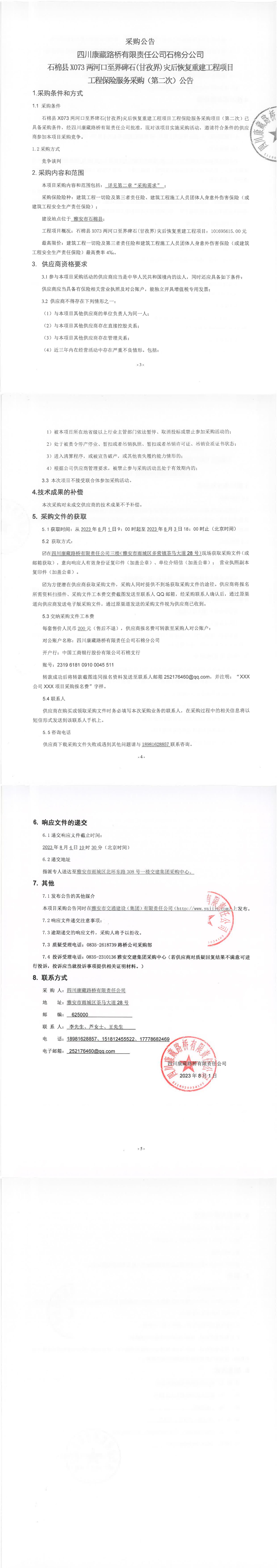 四川康藏路橋有限責(zé)任公司石棉分公司石棉縣X073兩河口至界碑石(甘孜界)災(zāi)后恢復(fù)重建工程項(xiàng)目工程保險(xiǎn)服務(wù)采購(gòu)(第二次)公告