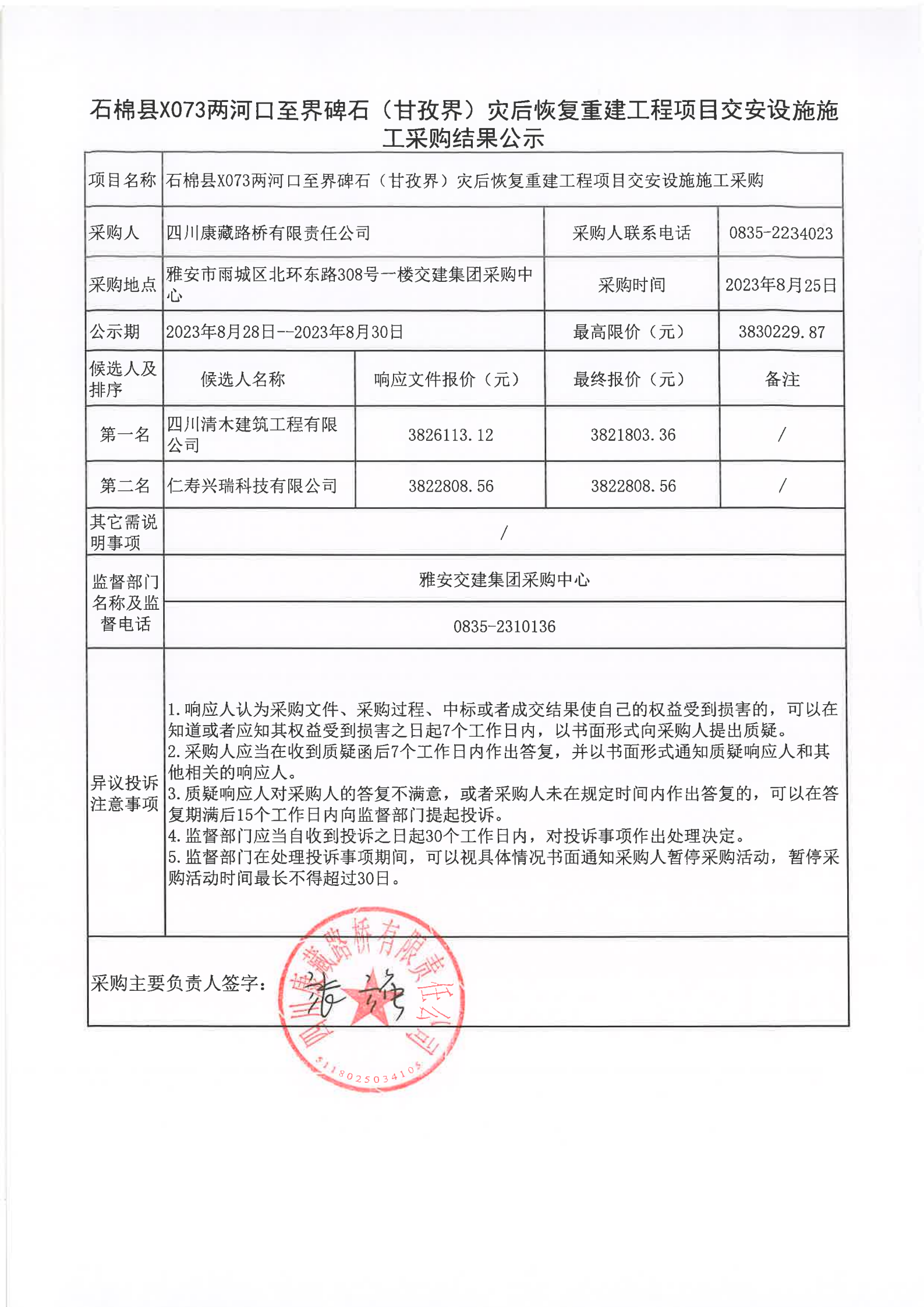 四川康藏路橋有限責任公司石棉縣X073兩河口至界碑石(甘孜界)災后恢復重建工程項目交安設(shè)施施工采購結(jié)果公示