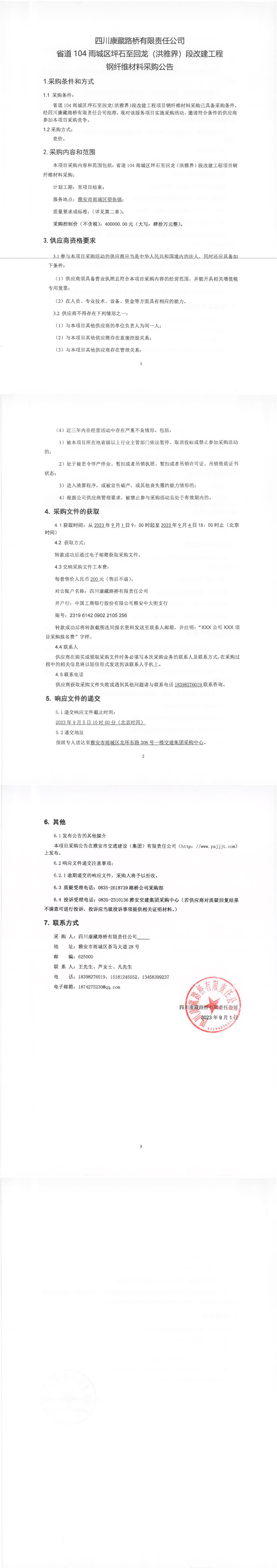 四川康藏路橋有限責任公司省道104雨城區(qū)坪石至回龍(洪雅界)段改建工程鋼纖維材料采購公告